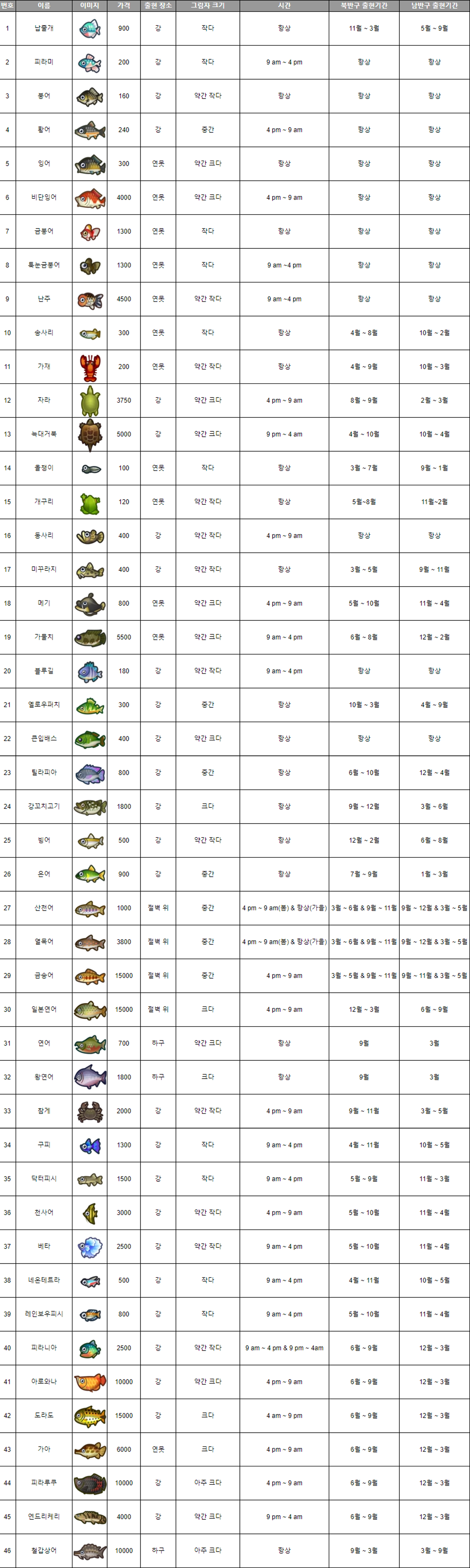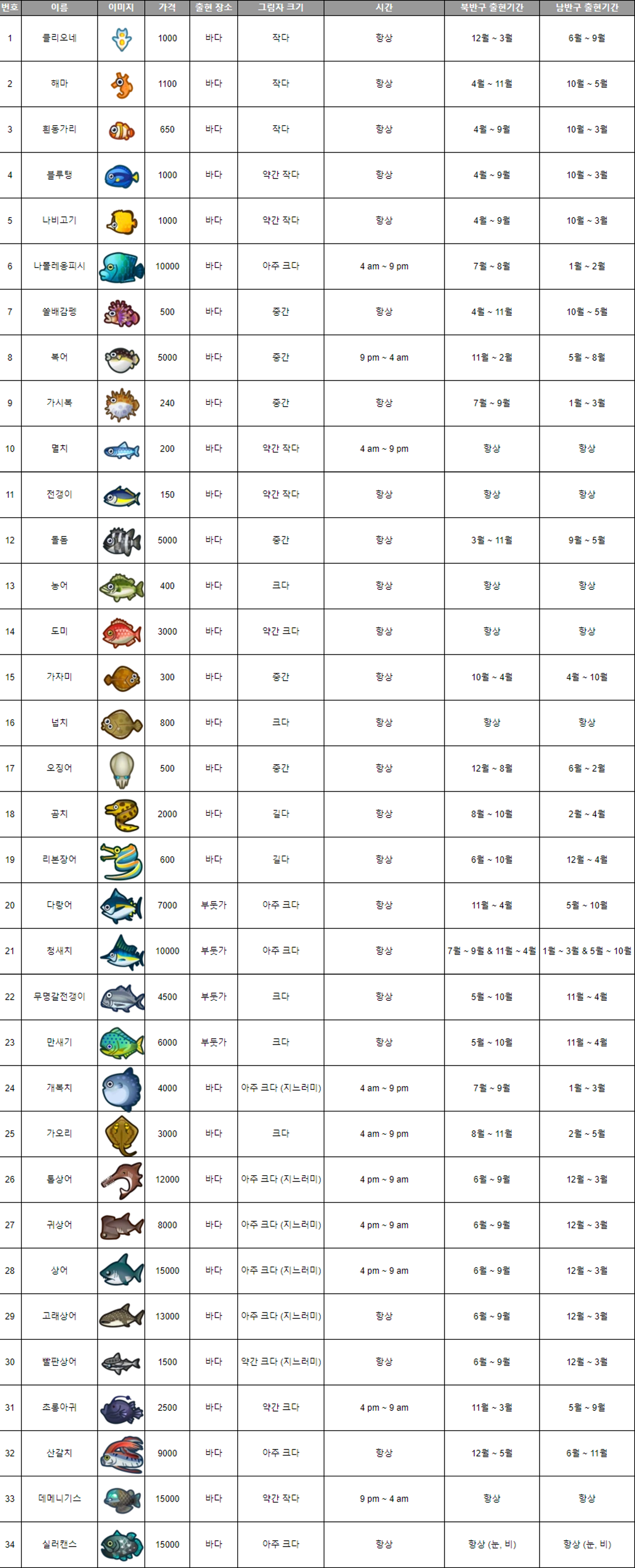 | [모여봐요 동물의 숲] 해산물 도감 (가격, 시간, 출현 기간 등) (0) | 2020.12.01 |